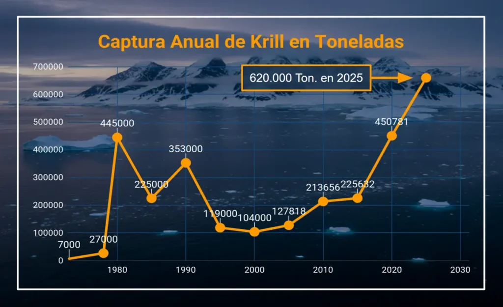 La captura de krill antártico ha escalado de forma estrepitosa, superando las 600.000 toneladas en 2025 — frente a apenas 7.000 en 1973. Este volumen no representa solo un interés comercial por el Omega-3 o la acuicultura: refleja la capacidad de las naciones para operar de forma sostenida en el Océano Austral. El krill es el recurso que permite «normalizar» la presencia económica en la región, alterando el equilibrio diplomático que mantenía a la Antártida al margen de las dinámicas del mercado global.