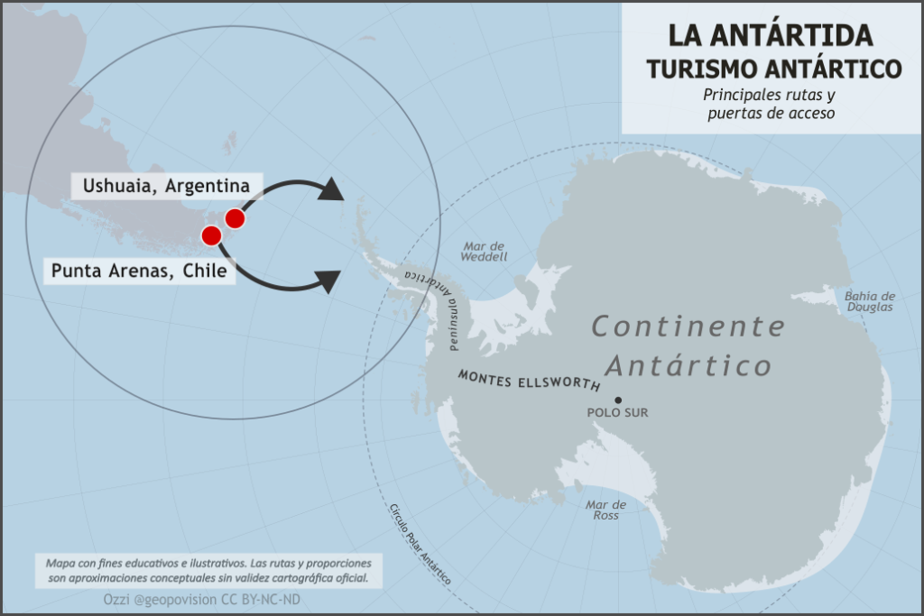 Ushuaia y Punta Arenas se han consolidado como las puertas de entrada definitivas, procesando más del 90% del tráfico marítimo antártico. Aproximadamente el 90% de los cruceros a la Antártida parten desde Ushuaia, donde los pasajeros suelen pernoctar antes de embarcarse hacia el continente.